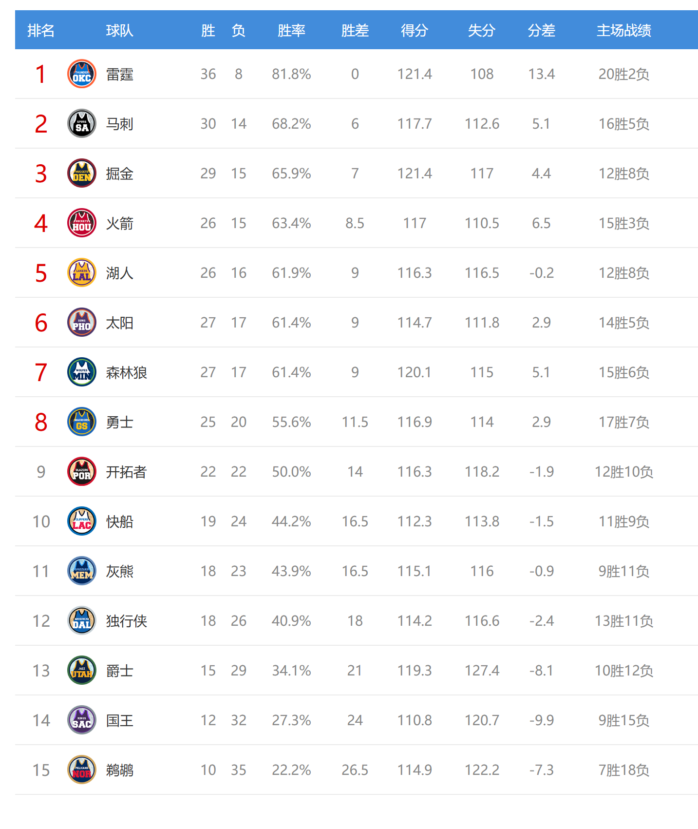 今日比赛后火箭、湖人、太阳、森林狼排名互换,其他西部球队排名不变。